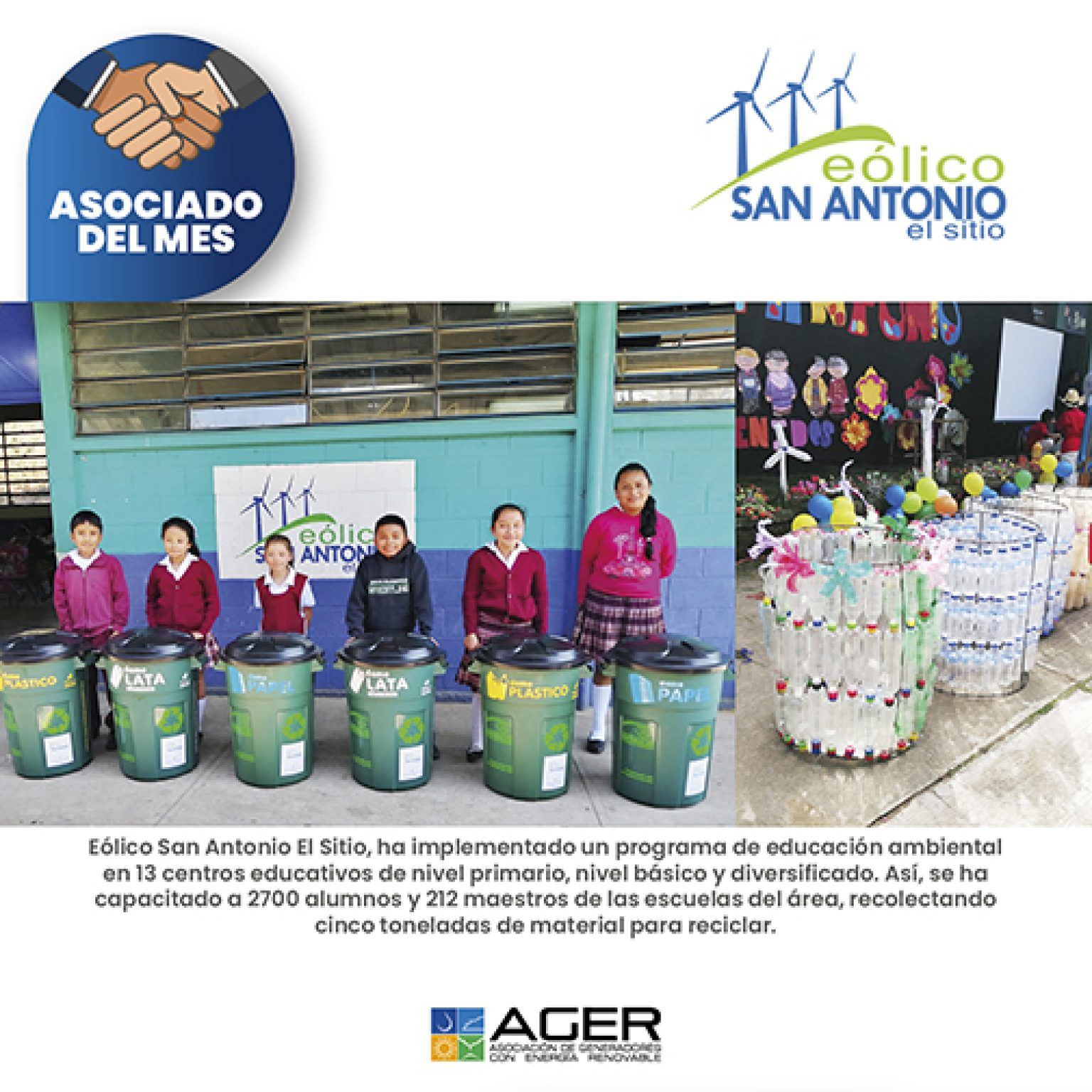 Eólico San Antonio El Sitio ha implementado un programa de educación ambiental en 13 centros educativos de nivel primario, nivel básico y diversificado. Así, se ha capacitado a 2,700 alumnos y 212 maestros de las escuelas del área, recolectando cinco toneladas de material para reciclar.