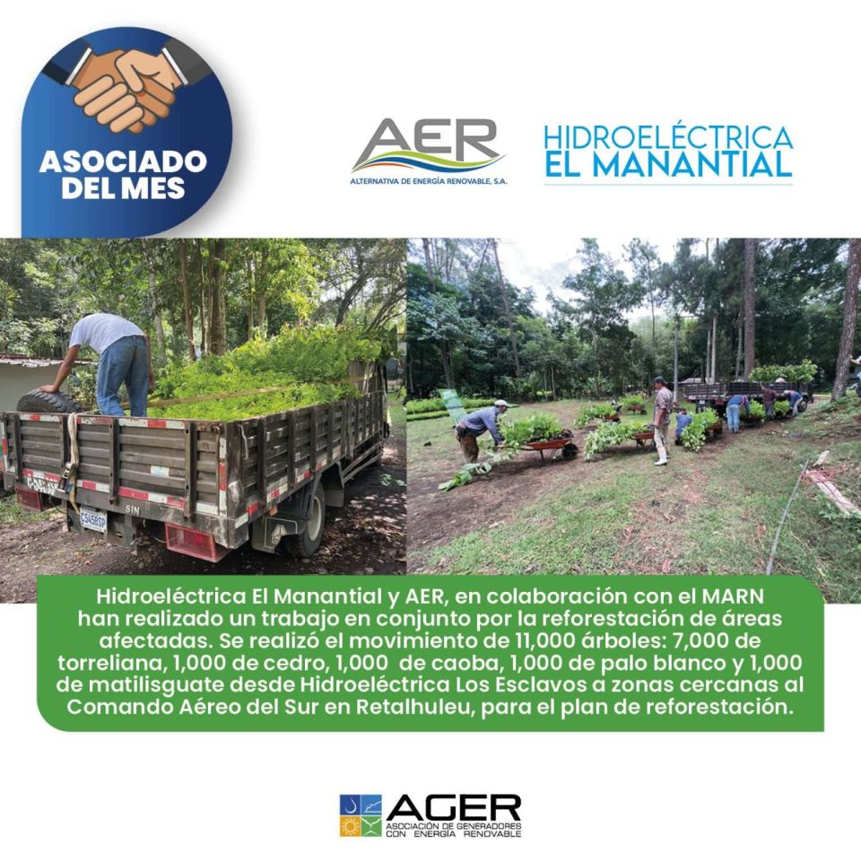 AER por medio de Hidroeléctrica el Manantial, como parte de sus responsabilidades sociales y ambientales ha logrado la movilización de 11,000 árboles, el equivalente a 10 hectáreas de bosque, apoyando al medio ambiente en la zona de Retalhuleu.