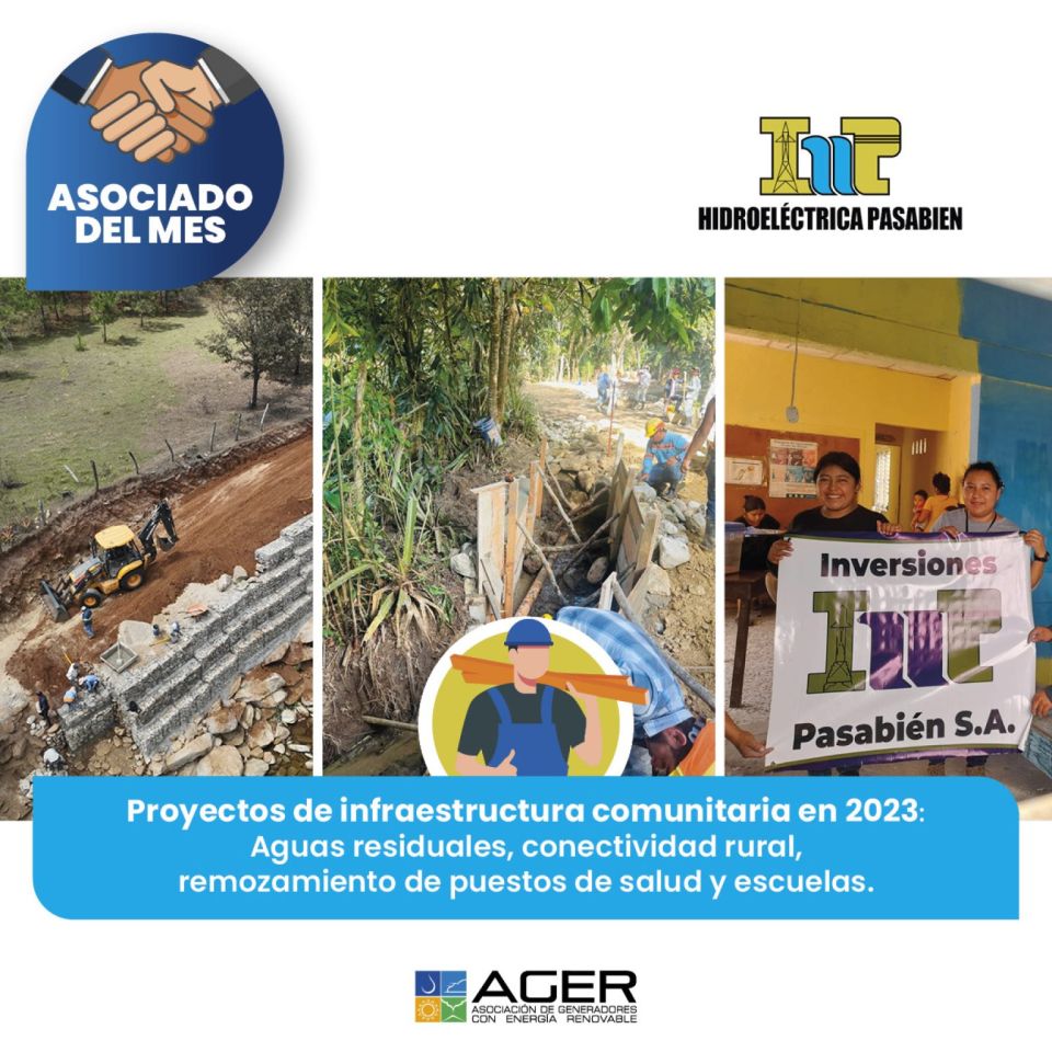 En alianza con los Consejos Comunitarios de Desarrollo de las comunidades vecinas, nuestro Asociado del Mes Hidroeléctrica Pasabién, se ejecutaron proyectos de infraestructura comunitaria en 2023: aguas residuales, conectividad rural, remozamiento de puestos de salud y escuelas. Esto como parte de su pilar de Gestión Social: Infraestructura comunitaria.