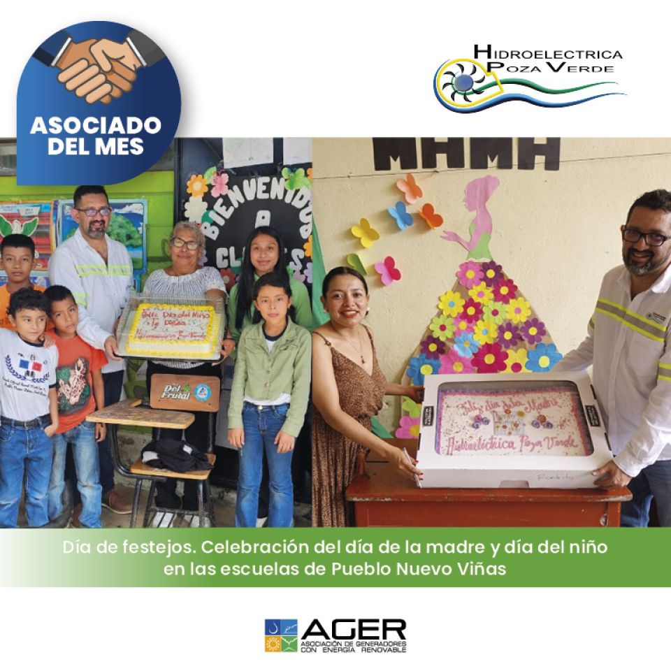 Nuestro #AsociadoDelMes Hidroeléctrica Poza Verde celebra anualmente eventos emblemáticos en las 16 escuelas de pre-primaria y primaria bajo su cobertura. Este año, se homenajeó a las madres de los alumnos y se celebró el Día del Niño. Compartir un pastel y festejar con los niños es una tradición que les llena de alegría y que ellos esperan con entusiasmo cada año. Es un honor contribuir a su felicidad y bienestar.